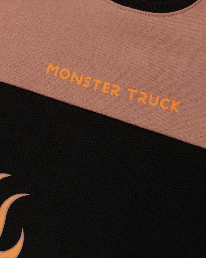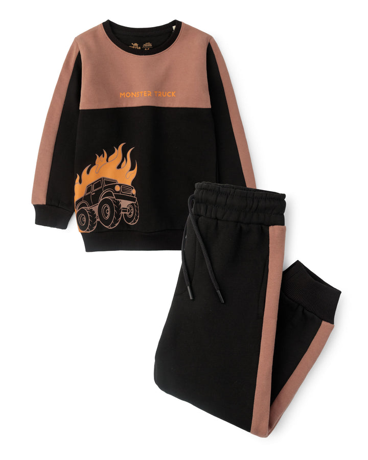 A bold two-pack featuring a color-blocked sweatshirt with front print and matching joggers with contrast side panels and drawstring waist, designed for soft fleece comfort