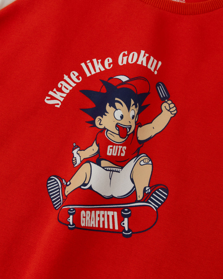 A soft fleece raglan sweatshirt in vibrant red hue with contrast sleeves, styled with a sporty front graphic, ribbed trims, and a relaxed modern fit for everyday wear.