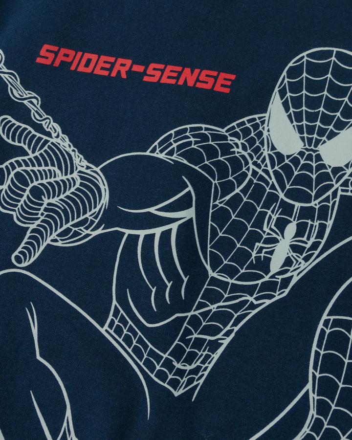 A navy sweatshirt crafted from soft fleece, showcasing a bold graphic print, ribbed trims, and a relaxed fit for everyday superhero comfort.
