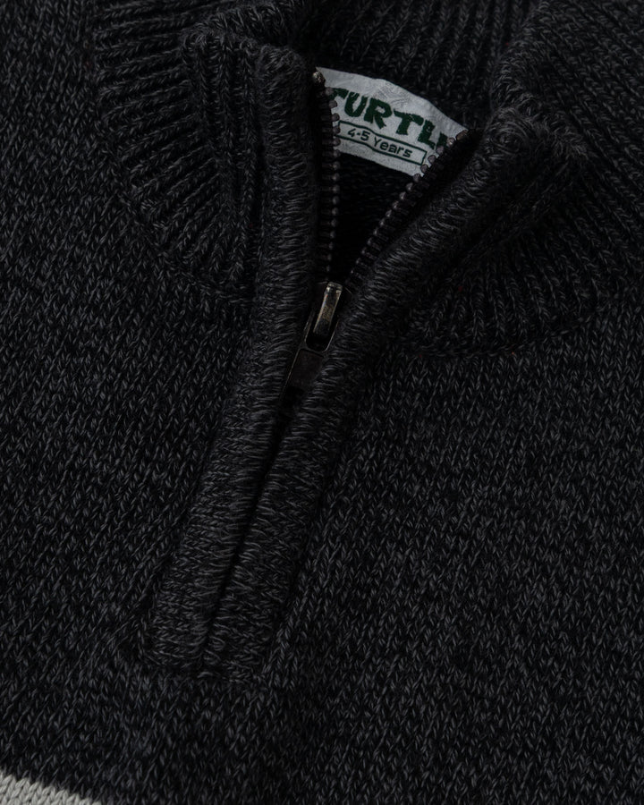 A textured half-zip knitted sweater with twin grey stripes and a subtle badge on front, finished with ribbed edges for a clean, contemporary winter look.
