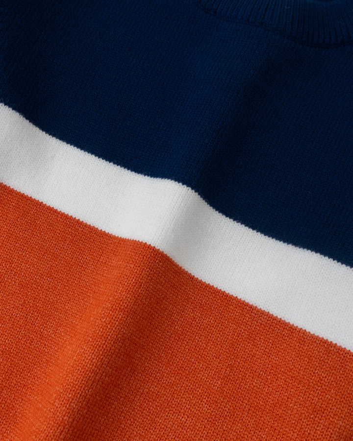 An elevated color-block knit sweater, tailored with ribbed accents and a structured silhouette for a contemporary refined appeal.