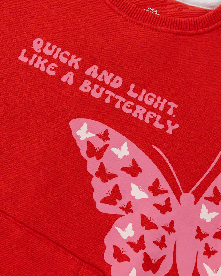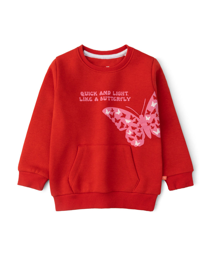 A fleece-crafted crewneck sweatshirt with a striking graphics, kangaroo pocket, and ribbed edges, ideal for layering and outdoor wear.