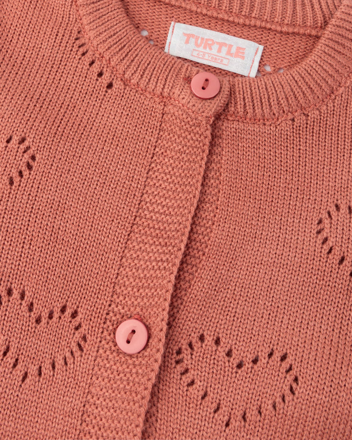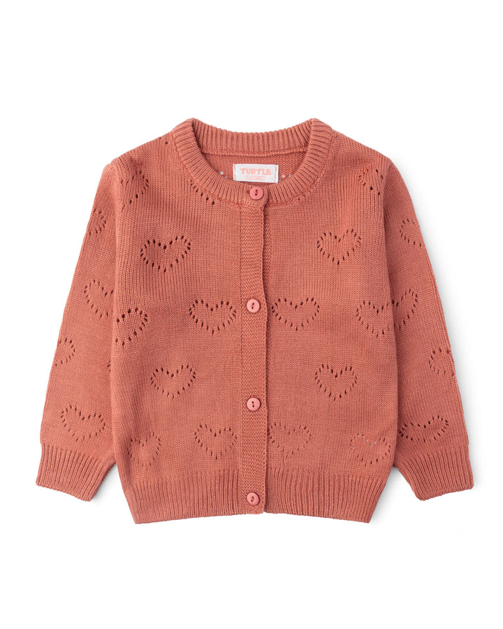 A soft knit cardigan in dusty rose tones, detailed with heart motifs, front button closure, and ribbed edges blending playful charm with contemporary knitwear elegance.