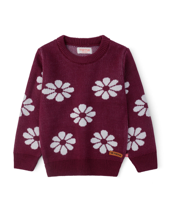 A dark-toned floral knit crafted with cozy texture sweater, featuring relaxed fit, ribbed trims, and a leather brand patch for adding a playful yet polished touch.
