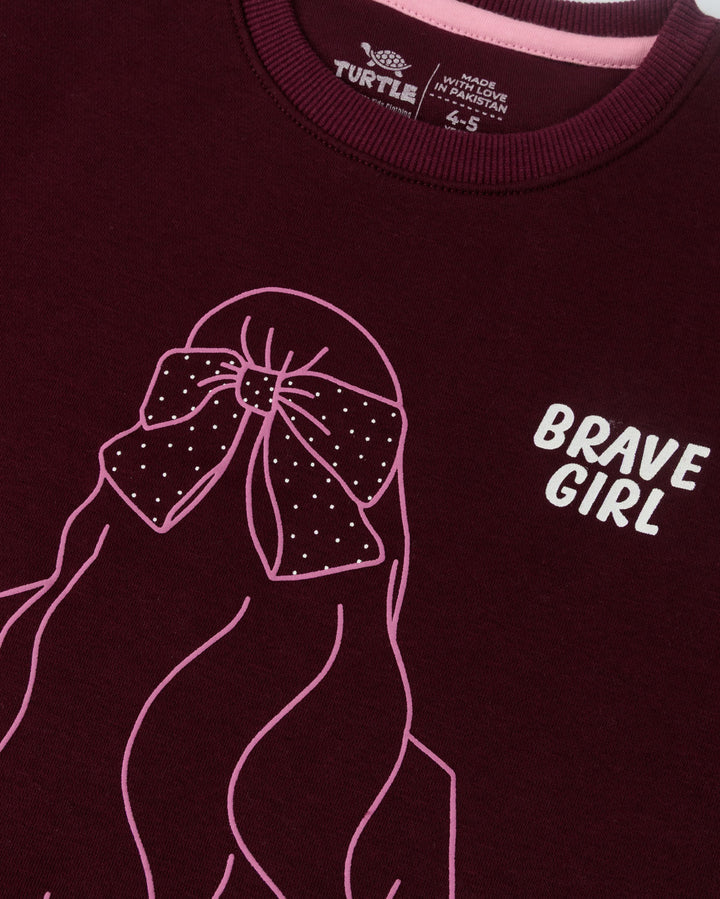 A deep plum fleece pack accented with line-art graphics, smooth rib trims, plush winter warmth, and a coordinated jogger with a draw cord waist for polished casual styling.