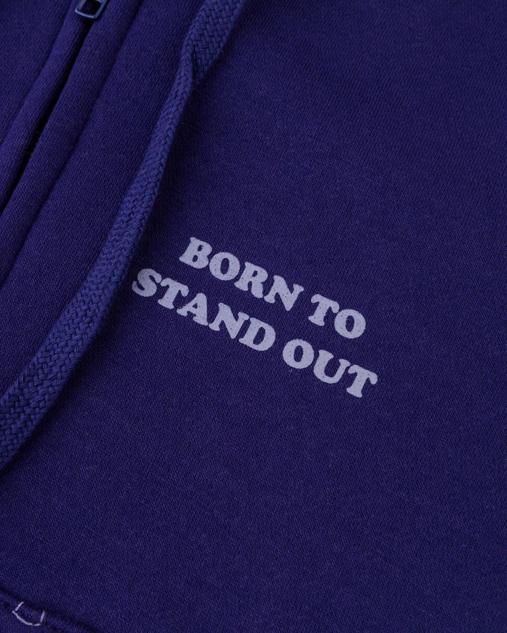 A cozy fleece zip-up hoodie with a contrast hood lining, kangaroo print pockets, adjustable draw cords, ribbed cuffs and hem, and a chest print for a bold, fashion-forward look.