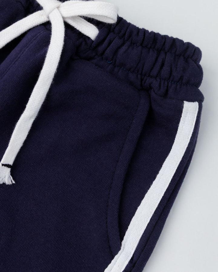 A navy fleece jogger framed with contrast side-taping, soft hand-feel, roomy pockets, and a snug elasticated waist and cuffs for effortless athletic comfort.